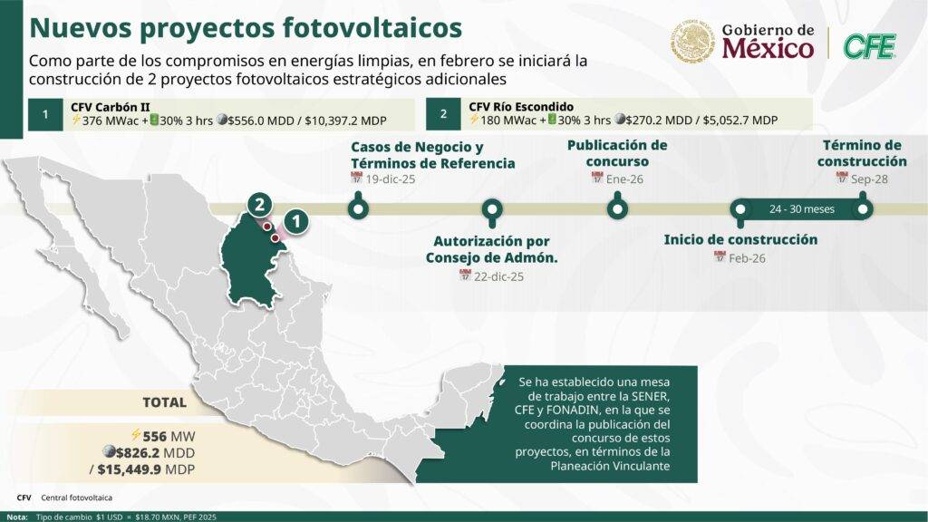 Detalló que las Centrales Fotovoltaicas Carbón II y Río Escondido, en Coahuila, aportarán 556 MW de capacidad con una inversión estimada de 15 mil 449.9 mdp.
