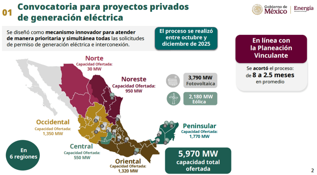 La secretaria de Energía, Luz Elena González, agregó que el pasado 17 de octubre se emitió una convocatoria para los proyectos privados de generación eléctrica.