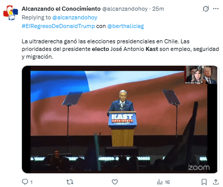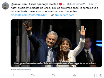 Regeneración, 15 de diciembre 2025– El ultraderechista José Antonio Kast fue elegido presidente de Chile al vencer a la izquierdista Jeannette Jara, según los resultados oficiales preliminares, en una segunda vuelta que lo tenía como favorito luego de haber recibido el apoyo de otros líderes afines.