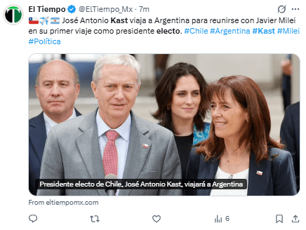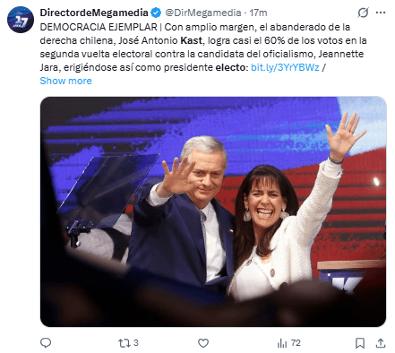 “La democracia habló fuerte y claro. Me acabo de comunicar con el Presidente electo @joseantoniokast para desearle éxito por el bien de Chile”, señaló.