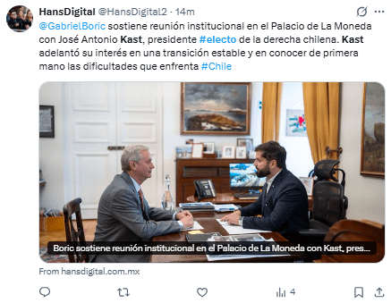 Más tarde, en un mensaje frente a sus simpatizantes, dijo a Kast que lo apoyará en las acciones que considere son benéficas para Chile y expresará su desacuerdo en las que vea como un retroceso.