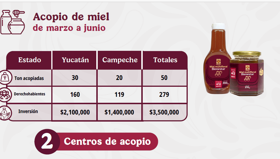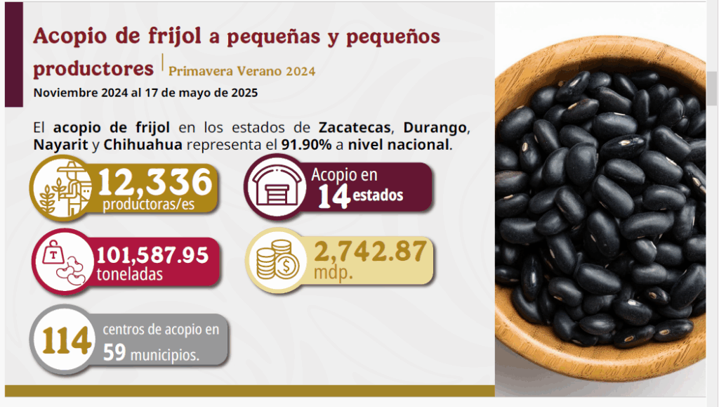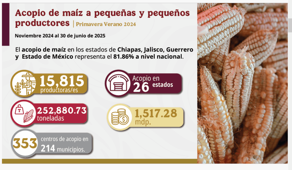 Finalmente, se precisa que para la producción de todos los alimentos que se venden en las Tiendas Bienestar, se han acopiado en total 355 mil 593 toneladas de maíz , frijol, café, cacao y miel.