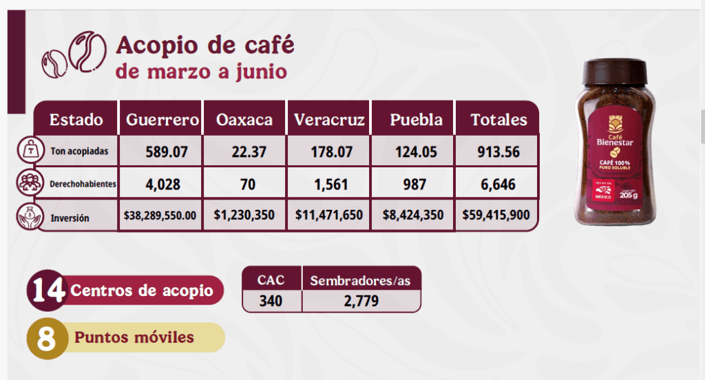 Lo anterior, a través de una inversión de 101 mil 179.45 millones de pesos, beneficiando a 36 mil 879 productoras y productores de los cuales 4 mil 630 forman parte de Sembrando Vida de café y cacao.