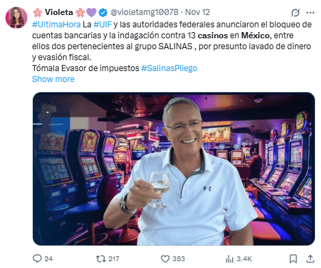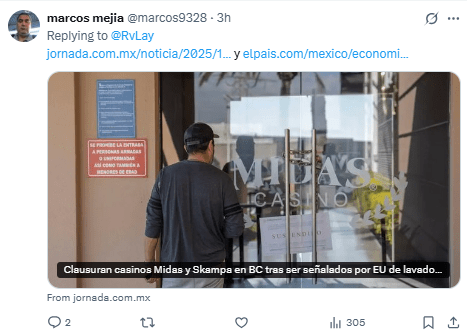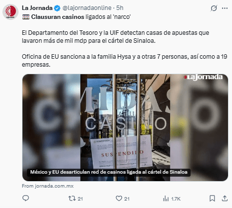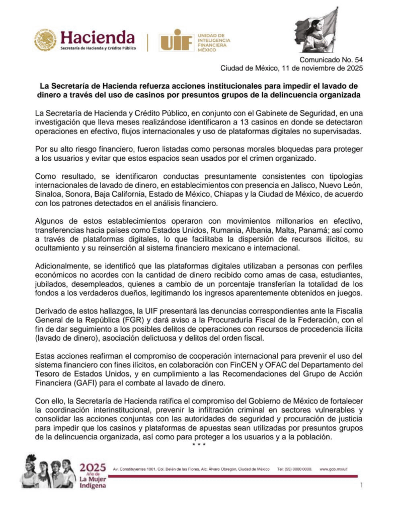 Regeneración, 14 de noviembre 2025– La Red de Control de Delitos Financieros (FinCEN) del Departamento del Tesoro de Estados Unidos restringió el acceso al sistema financiero a 10 establecimientos de juego ubicados en México por presuntamente ser usados para lavar dinero del cártel de Sinaloa.