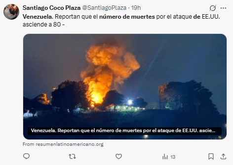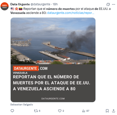 Regeneración, 5 de enero 2026– Este domingo, el número de fallecidos tras el ataque militar de Estados Unidos en Venezuela ascendió a 80, según información difundida por The New York Times y atribuida a un alto representante del Gobierno venezolano.