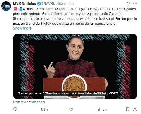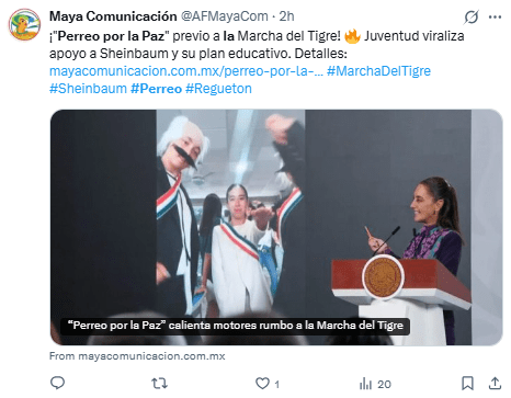 Regeneración, 3 de diciembre 2025– Además de la Marcha del Tigre, movilización que se llevará a cabo el próximo sábado 6 de diciembre para mostrar apoyo a la presidenta Claudia Sheinbaum, se ha convocado por redes a un «Perreo por la Paz», como antesala a la marcha mencionada.
