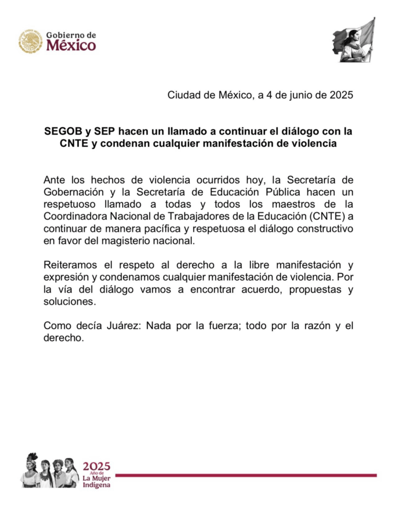 Regeneración, 4 de junio de 2025. En redes destacan que los maestros de la Coordinadora Nacional de Trabajadores de la Educación (CNTE), rechazaron la presencia de encapuchados que intentaron ingresar a Gobernación.