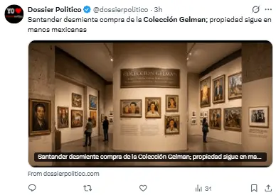 Regeneración, 31 de marzo 2026– En la conferencia matutina del lunes 30 de marzo, la secretaria de Cultura, Claudia Curiel de Icaza, negó que la Colección Gelman haya sido vendida o que haya riesgo de que las obras se queden fuera de México de manera definitiva.