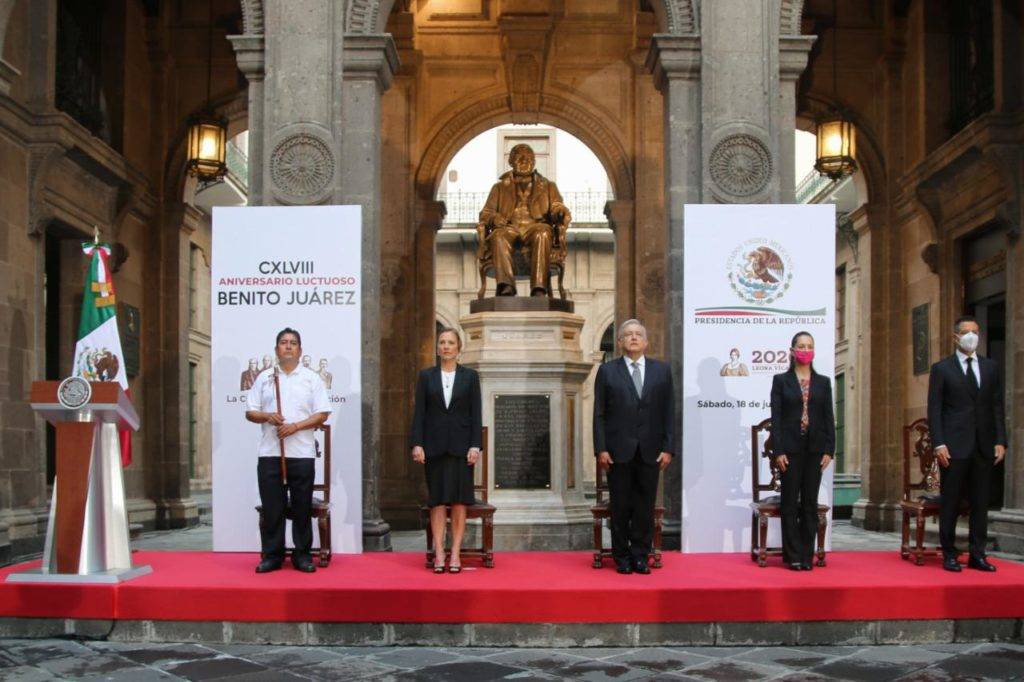 Regeneración, 18 de julio de 2020. Desde el Patio Mariano de Palacio Nacional, el presidente Andrés Manuel López Obrador, en compañía de su esposa Beatriz Gutiérrez Mueller, así como de la jefa de gobierno de la CDMX, Claudia Sheinbaum Pardo, el gobernador de Oaxaca, Alejandro Murat Hinojosa, y como invitado especial, presidente municipal de Guelatao, Oaxaca, Federico Hernández Ramírez, se conmemoró el 148 aniversario de la muerte e Benito Juárez García.