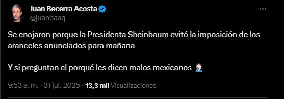«…, de los aranceles son para todo aquello que no está dentro del T-MEC. Entonces, es para lo que está fuera del T-MEC, es 25 por ciento».