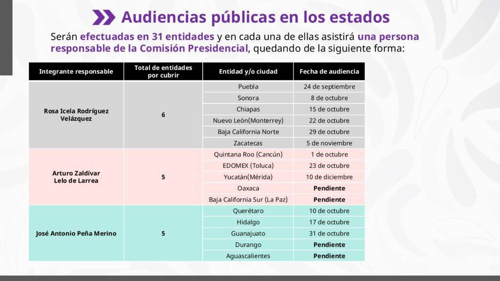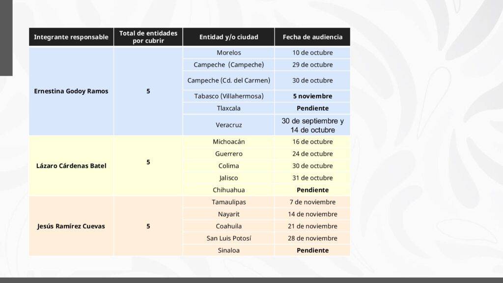 La consejera jurídica del Ejecutivo Federal, Ernestina Godoy Ramos, en Morelos, el 10 de octubre; Campeche, Campeche, el 29 de octubre; Ciudad del Carmen, Campeche, el 30 de octubre; Villahermosa, Tabasco, el 5 de noviembre; Veracruz, el 30 de septiembre y el 14 de octubre; así como en Tlaxcala, con fecha por definir.