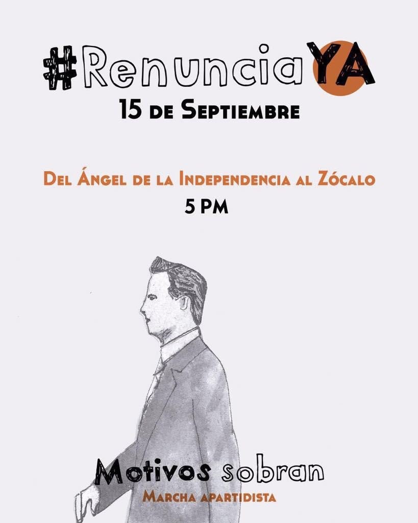 #RenunciaYa es el reclamo a Peña Nieto de cientos de mexicanos que convocan a una marcha con dirección Zócalo el día del grito de la Independencia.