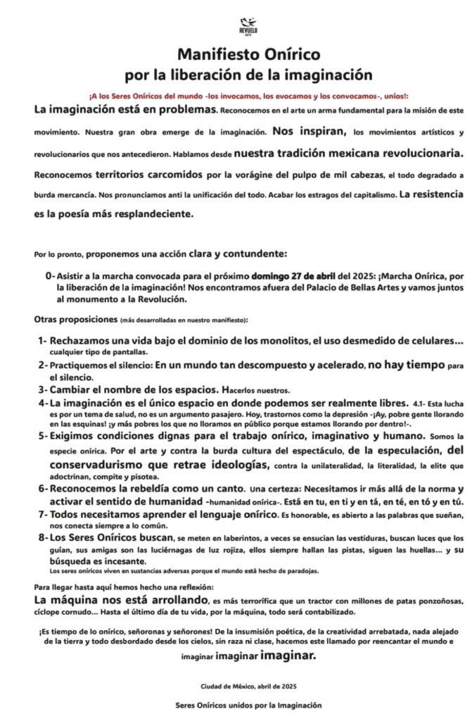 RegeneraciónMx, 26 de abril de 2025.- El colectivo Revuelo Artes, en alianza con otros colectivos y organizaciones de la Ciudad de México que dedican su labor al trabajo creativo convocan a la primera Marcha Onírica, la cual se llevará acabo el domingo 27 de abril del Palacio de Bellas Artes al Monumento a la Revolución