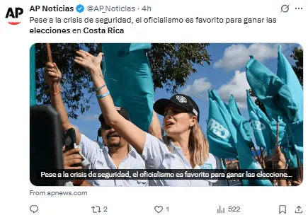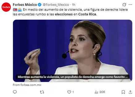 Ella se encuentra muy por delante de Álvaro Ramos, del Partido Liberación Nacional socialdemócrata, que ocupa el segundo lugar con un 8% de respaldo.