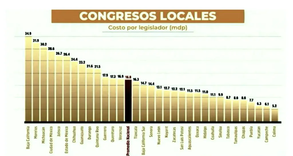 Lo que presentó en la gráfica es que el Congreso de Baja California, cuesta a los electores 34.9 millones de pesos, seguido de Morelos con 31.9 millones y Michoacán con 30.2 millones.