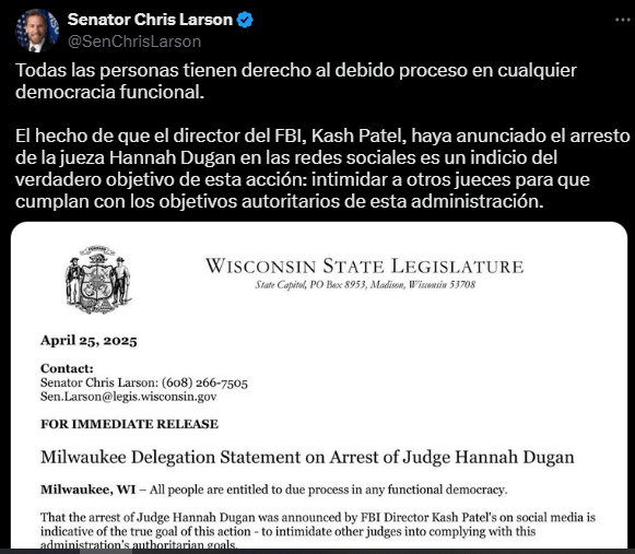 Regeneración, 25 de abril de 2025. En redes destacan protestas porque en Milwaukee el FBI arrestó a la jueza Dugan acusada de obstruir arresto de indocumentado.
