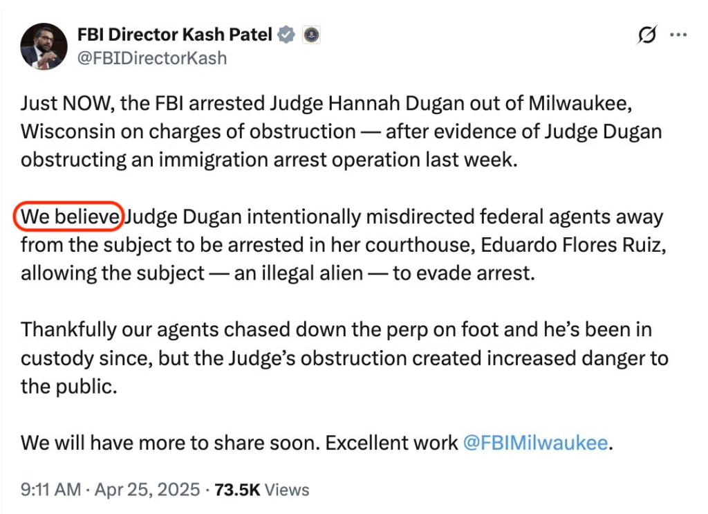 El FBI arrestó a la jueza Hannah Dugan de Milwaukee, Wisconsin, por cargos de obstrucción, después de pruebas de que (…) obstruyó una operación migratoria de arresto la semana pasada», añadió.