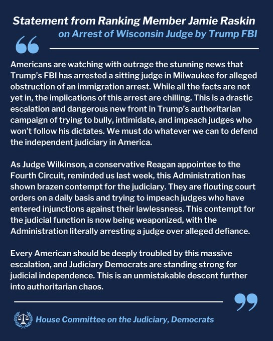 Al tiempo que el presidente del Comité Nacional Demócrata, Ken Martin, dijo estar alarmado por el hecho de que Trump ordene «a sus matones federales arrestar a una jueza debidamente electa».