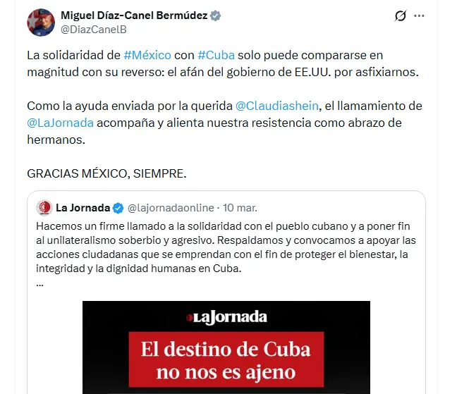 Regeneración, 13 de marzo de 2026. Como se anunció desde ayer en redes sociales el presidente de Cuba, Miguel Díaz-Canel compareció publicamente. Reveló conversaciones con Estados Unidos.