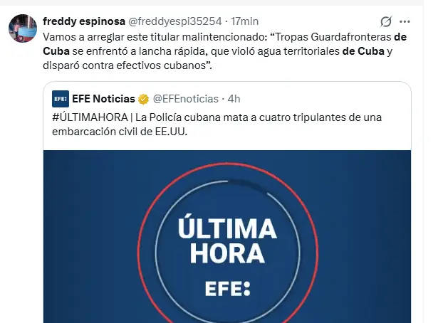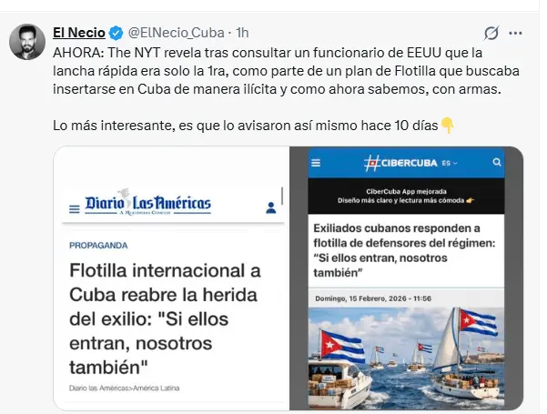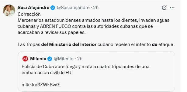 Regeneración, 25 de febrero de 2026. En redes sociales el ministerio de Interior de Cuba informó de un incidente con una lancha rápida de EE.UU con resultado de 4 ocupantes muertos y 6 heridos.