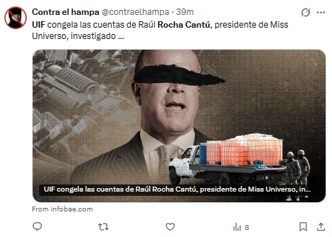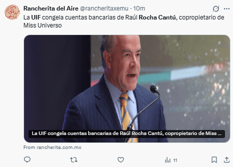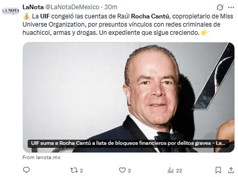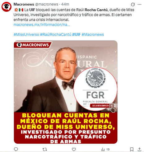 Regeneración, 5 de diciembre 2025– La Unidad de Investigación Financiera (UIF) bloqueó las cuentas de Raúl Rocha Cantú, uno de los dueños de Miss Universo que pasó a ser testigo protegido de la Fiscalía, luego de una orden de captura por los delitos de tráfico de armas, droga y huachicol.