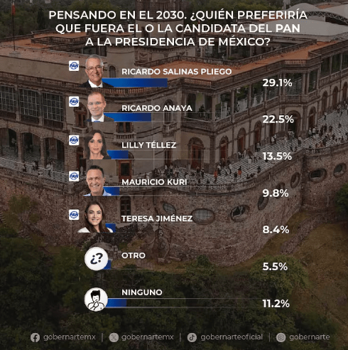 Por otra parte, nuevas encuestas publicadas hoy posicionan a Salinas Pliego como el perfil favorito entre los simpatizantes del Partido Acción Nacional (PAN) para la candidatura presidencial de 2030.