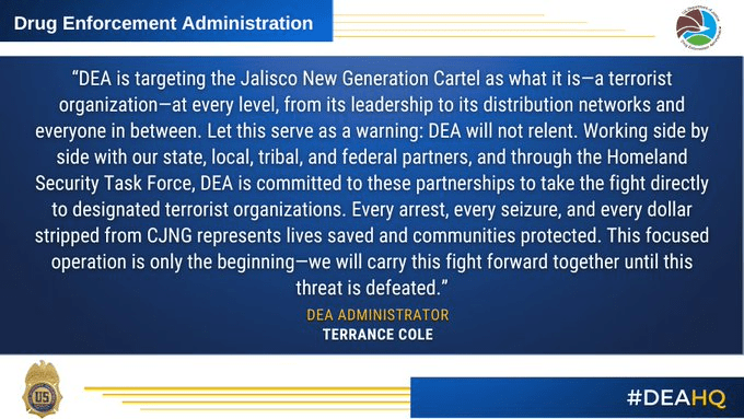 “La DEA está apuntando contra el Cártel Jalisco Nueva Generación como lo que es, una organización terrorista, en todas sus dimensiones: desde su liderazgo…»