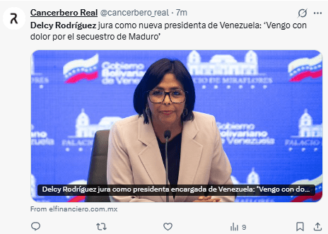 Regeneración, 5 de enero 2026– Delcy Rodríguez, vicepresidenta de Venezuela, ha tomado el cargo de presidenta encargada, luego de que la Sala Constitucional del Tribunal Supremo de Justicia (TSJ) determinara que debía asumir el control del Ejecutivo tras al arresto del presidente Nicolás Maduro por el gobierno de Estados Unidos.