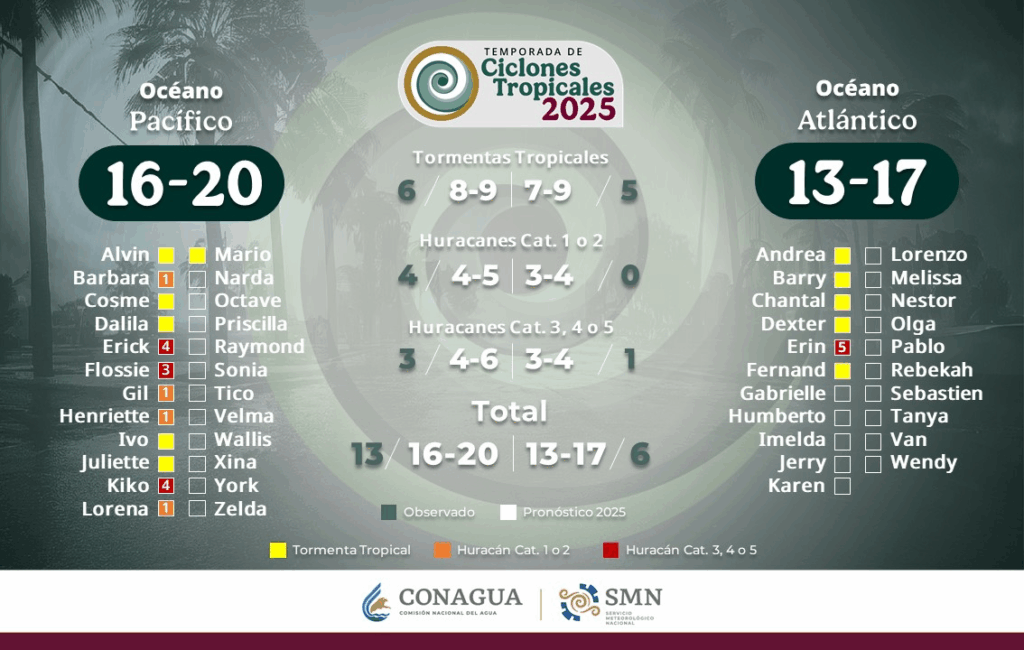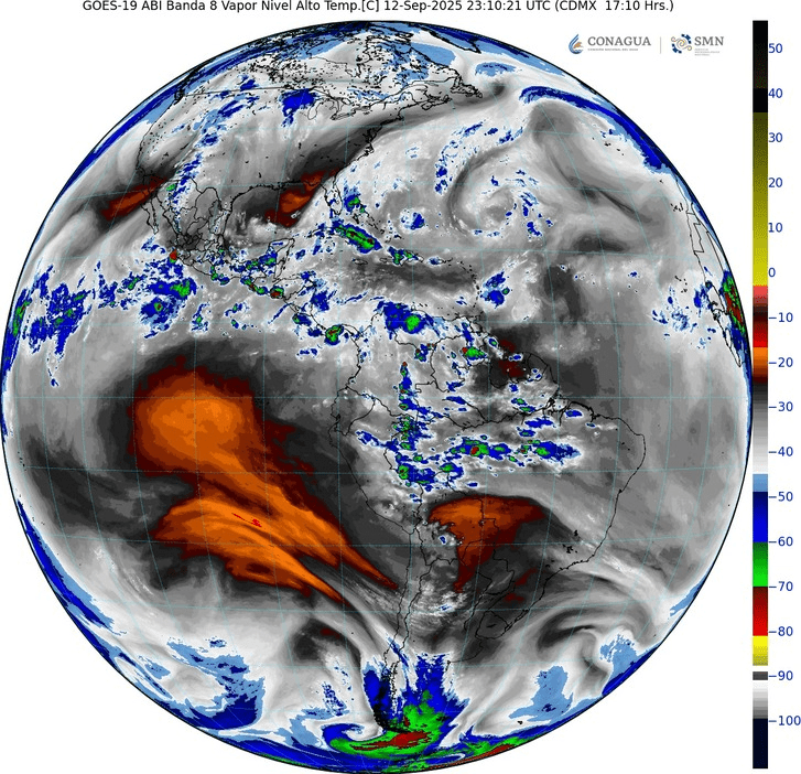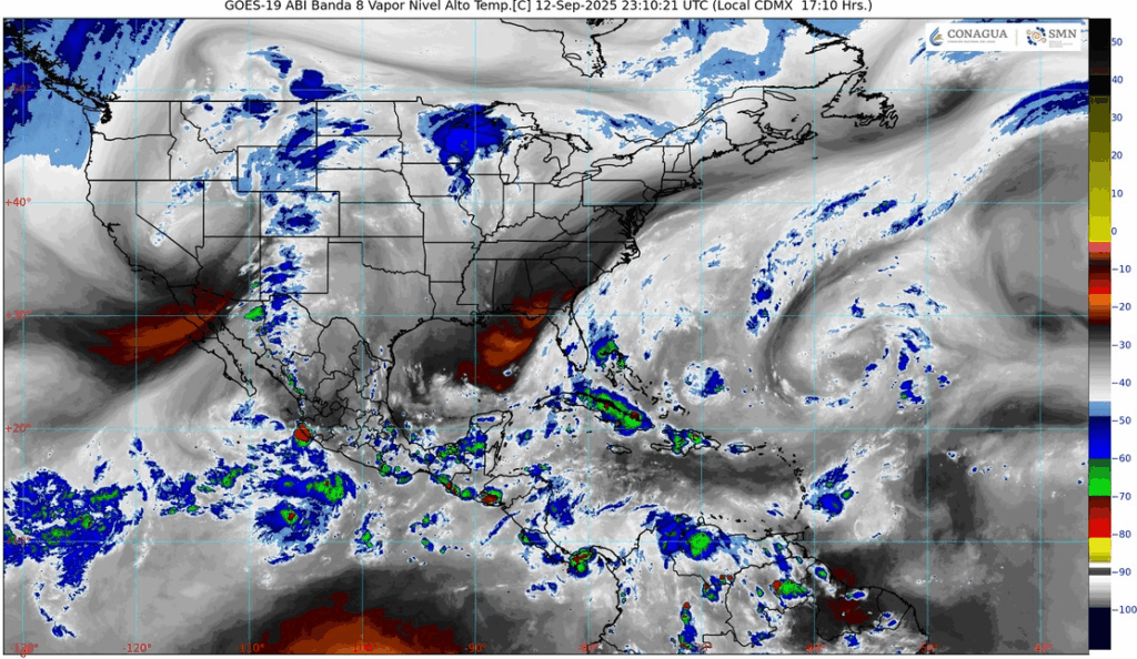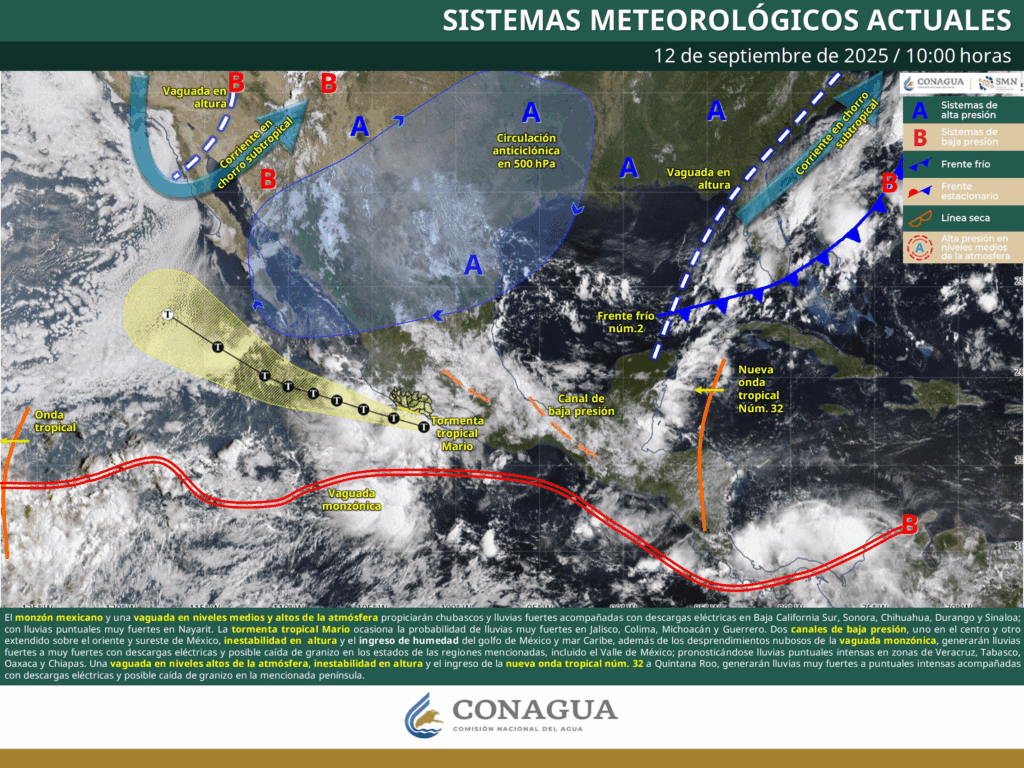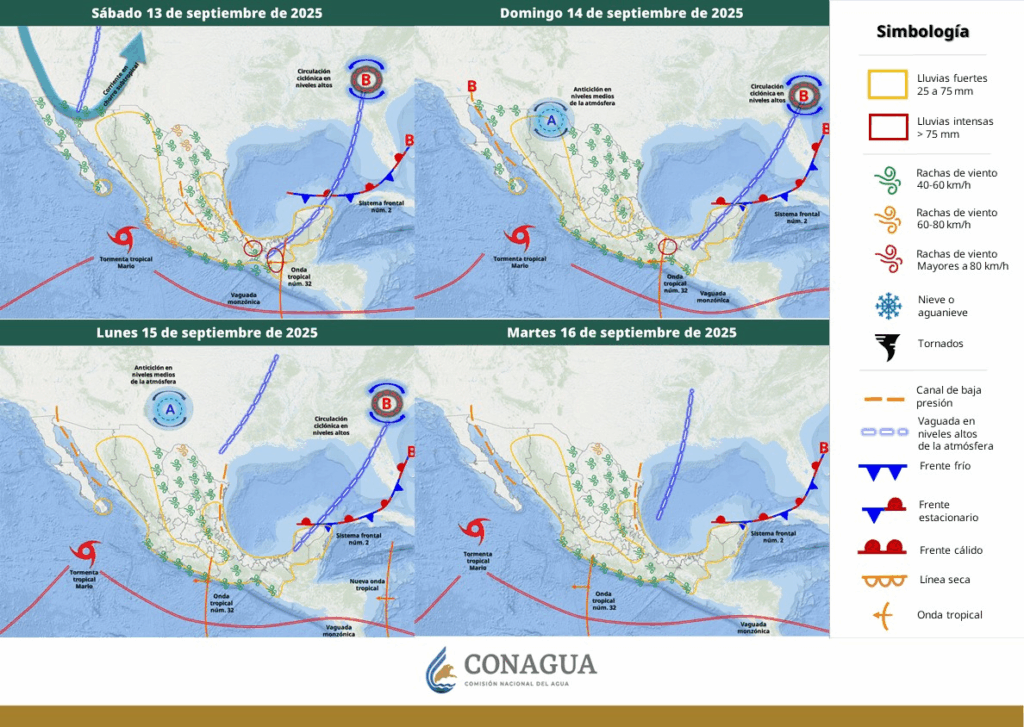 Del domingo 14 al martes 16 de septiembre de 2025, el monzón mexicano, una vaguada en niveles medios y altos de la atmósfera, ocasionarán probabilidad de lluvias fuertes a muy fuertes.