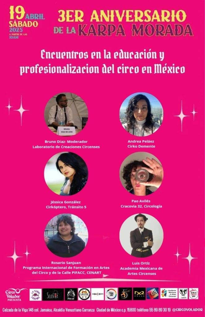 Esta tarde de día mundial del circo, Andrea Peláez,co fundadora de Cirko De Mente, participa junto a otros artistas de esta disciplina en el aniversario de la Karpa Morada (Circo Volador: Calzada de la Viga 146. Col. Jamaica. Ciudad de México), como parte de la Mesa: “Encuentros en la profesionalización y educación del Circo en México”. Hoy sabado 19 de abril. 18:00 Hrs.