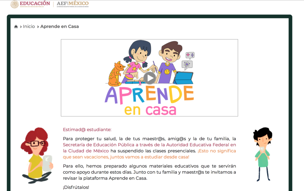 Ante este reconocimiento, el Secretario de Educación Pública, Esteban Moctezuma Barragán, reiteró que México por esta contingencia sanitaria diseño el programa Aprende en Casa, el cual mantiene a nivel nacional la prestación de servicios educativos a través, tanto de la televisión como del internet, para llevar educación a distancia a niñas, niños, adolescentes y jóvenes que se encuentra en aislamiento preventivo.