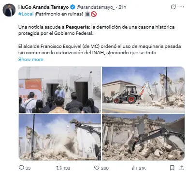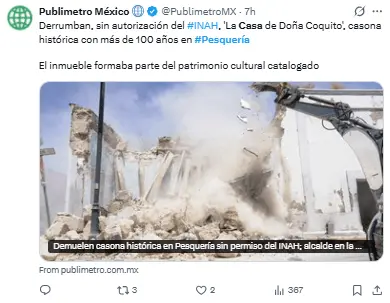 Regeneración, 30 de marzo 2026– El alcalde del municipio de Pesquería, en el estado de Nuevo León, Francisco Esquivel, ha recibido críticas por decidir demoler una antigua casa en el centro, considerada patrimonio cultural por las autoridades federales.