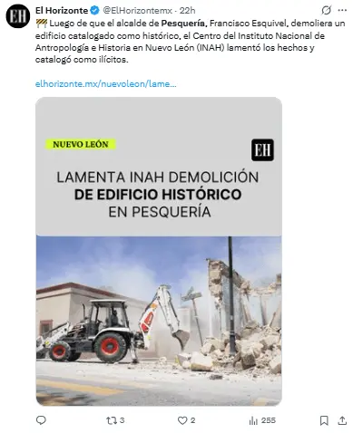 …en un municipio fundando en el siglo XVI, demoliendo inmuebles históricos con el uso de recursos públicos”, denuncia el escrito del Centro INAH Nuevo León.