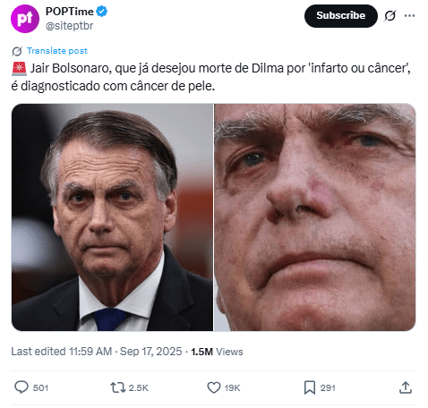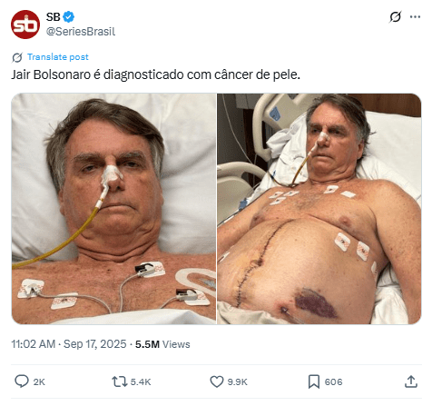 Regeneración, 18 de septiembre 2025– Siete días después de haber sido condenado a 27 años y tres meses de prisión por liderar un intento de golpe de Estado, el ex presidente brasileño Jair Bolsonaro fue diagnosticado con cáncer de piel.