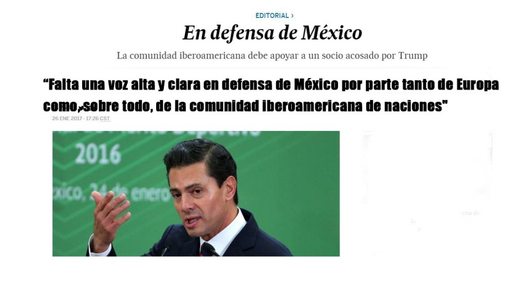 Regeneración, 27 de enero del 2017.-En su editorial titulado «En defensa de México», el diario El País de España llama a las naciones europeas y latinas a defender a los mexicanos.