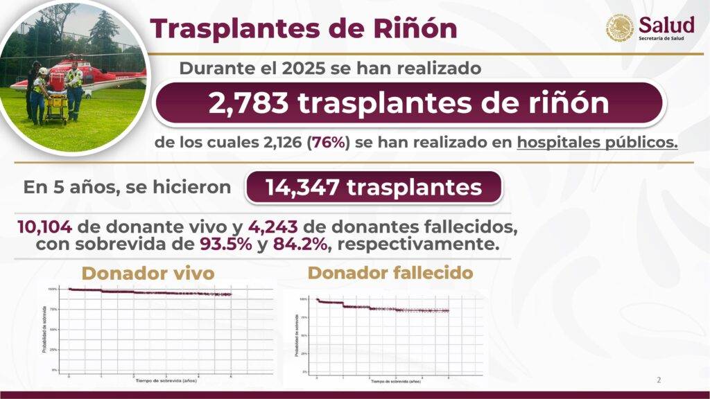 Explicó que se han realizado 2 mil 783 trasplantes de riñón. Y un dato importante es que 2 mil 126, el 76% se han realizado en hospitales públicos.