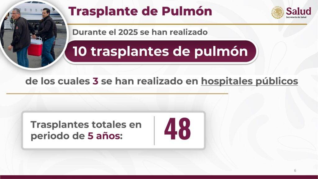 También, en 2025, se han realizado 10 trasplantes de pulmón, de los cuales, 3 [trasplantes] se han realizado en hospitales públicos y en total [en 5 años] han sido 48 [trasplantes].