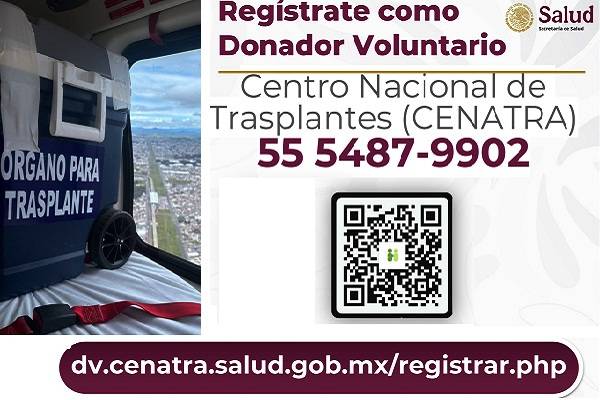 Para registrarse como donador voluntario. Está el teléfono del Centro Nacional de Trasplantes, está la liga [dv.cenatra.salud.gob.mx/registrar.php] en la cual se puede acceder.