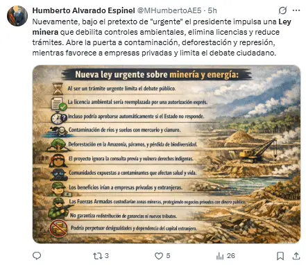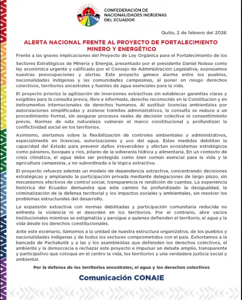 Regeneración, 4 de febrero 2026– La Confederación de Nacionalidades Indígenas de Ecuador (Conaie) expresó su rechazo este lunes al proyecto de ley de minería del presidente Daniel Noboa, al considerar que socava el control ambiental y pone en riesgo los derechos de las comunidades indígenas.