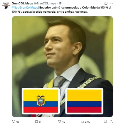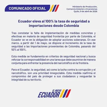 Regeneración, 10 de abril 2026– El Gobierno ecuatoriano comunicó el 9 de abril que elevará los aranceles a las importaciones colombianas del 50% al 100%, argumentando que su vecino no ha cumplido con las medidas de seguridad en la frontera.