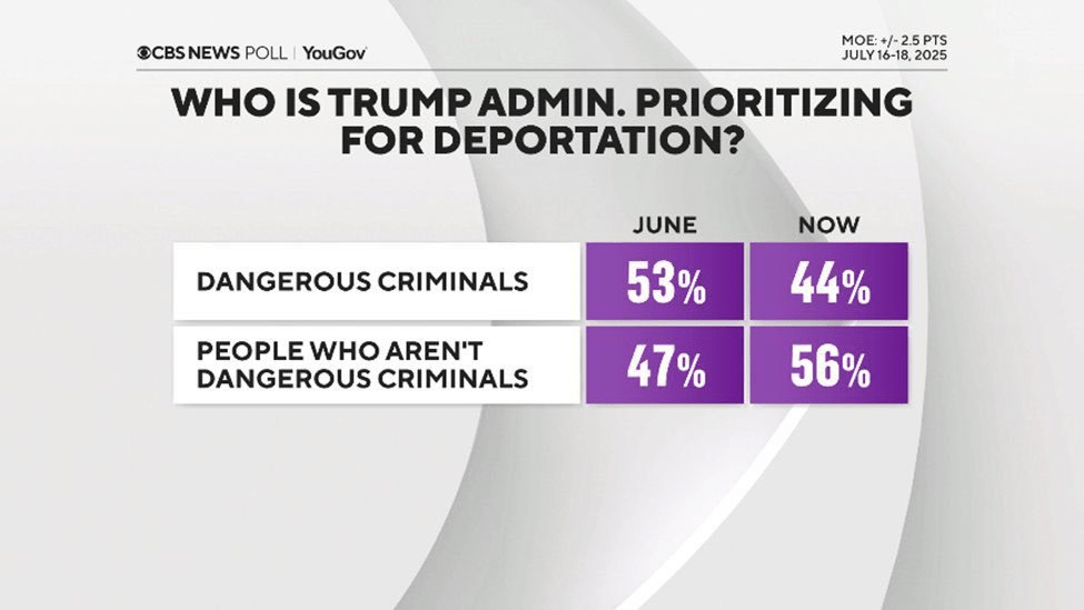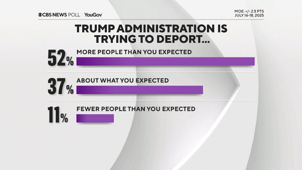 Por su parte, una encuesta realizada por CBS News revela que el 56 % considera que Trump está atacando a inmigrantes indocumentados que no representan una amenaza para la seguridad pública.
