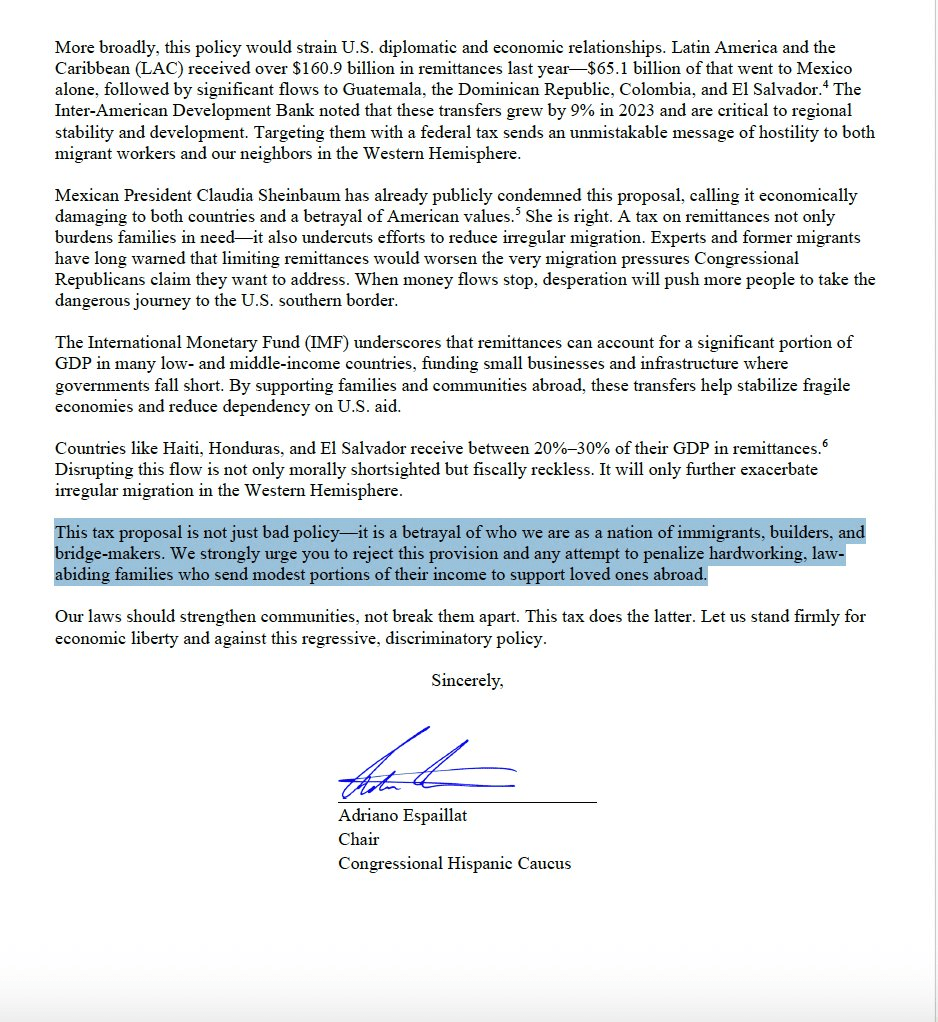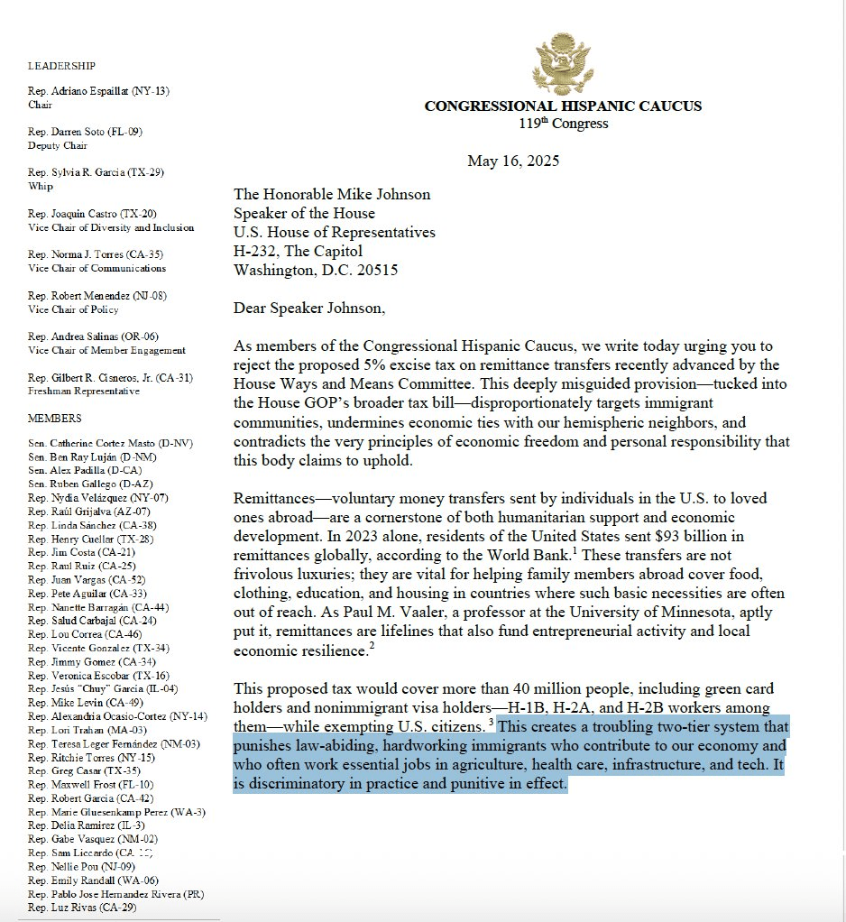 Por otra parte, congresistas de origen hispano solicitan que la Cámara de Representantes de EE.UU Unidos detenga el impuesto sobre las remesas.