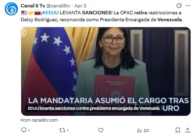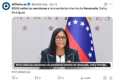 El Gobierno de Trump ha elogiado a Rodríguez como presidenta encargada, dando pasos en su favor como la eliminación de las sanciones que estaban en vigor desde 2018.