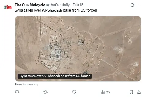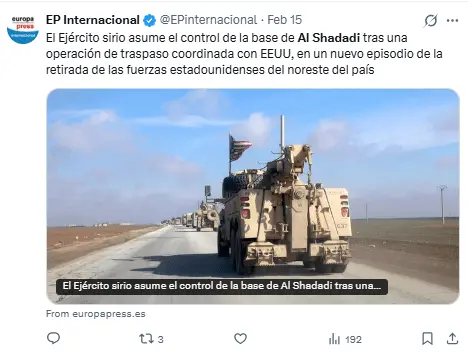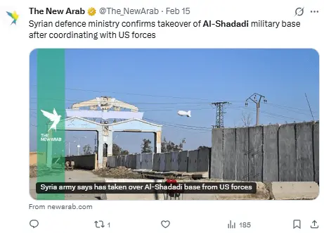 Regeneración, 16 de febrero 2026– Este 14 de febrero, el Ministerio de Defensa de Siria comunicó que la base militar de Al Shadadi, en la provincia de Hasaka, está ahora bajo la jurisdicción del Ejército sirio tras el traspaso de Estados Unidos, que se retiró de una de sus últimas ubicaciones en la zona.