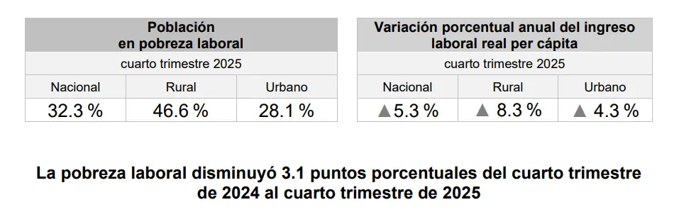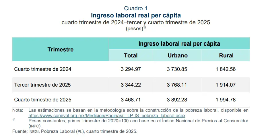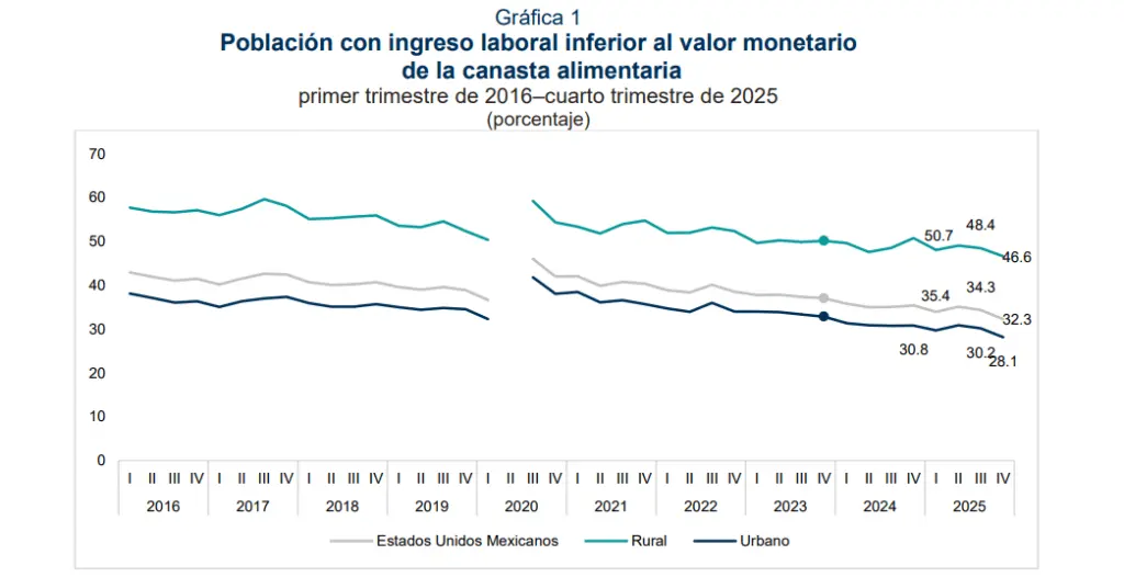 Además, en el ámbito rural, la pobreza laboral bajó de 50.7 en el cuarto trimestre del 20024 a 46.6% por ciento en el mismo periodo del 2025.