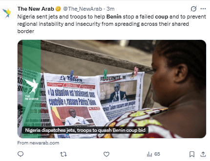 En respuesta a la solicitud del gobierno de Benín, el presidente nigeriano, Bola Tinubu, movilizó aviones de combate y tropas terrestres para ayudar a controlar el espacio aéreo y los objetivos clave.