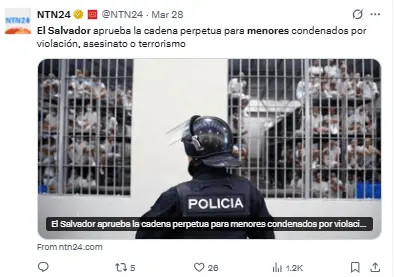 Regeneración, 16 de abril 2026– El Salvador ha establecido una ley reciente que facultará a las autoridades a imponer cadena perpetua a menores de solo 12 años por crímenes severos, tales como homicidio, terrorismo o abuso sexual.