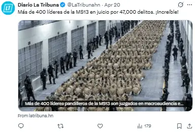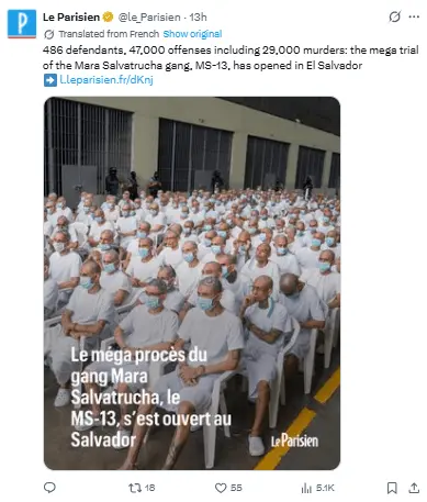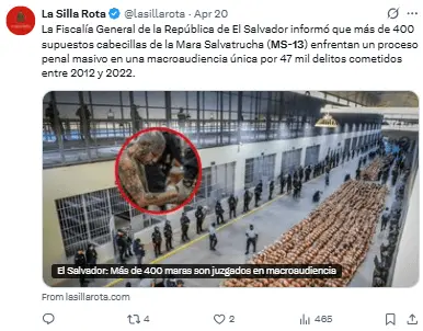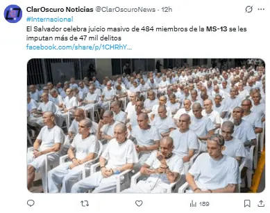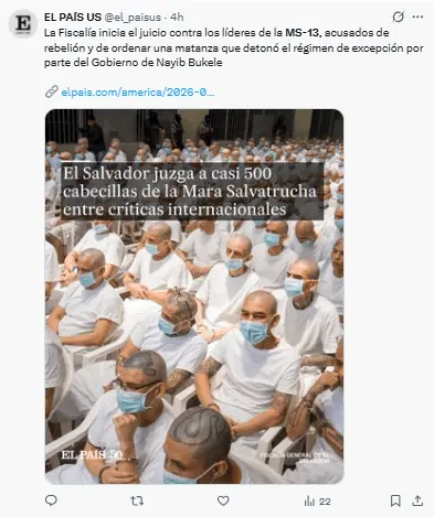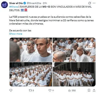 Regeneración, 22 de abril 2026– Más de 480 supuestos jefes de la pandilla Mara Salvatrucha enfrentan cargos por 47,000 crímenes cometidos entre 2012 y 2022 en una sola audiencia masiva. Es el juicio más grande contra los líderes de organizaciones criminales bajo el renovado sistema judicial del gobierno de Nayib Bukele.