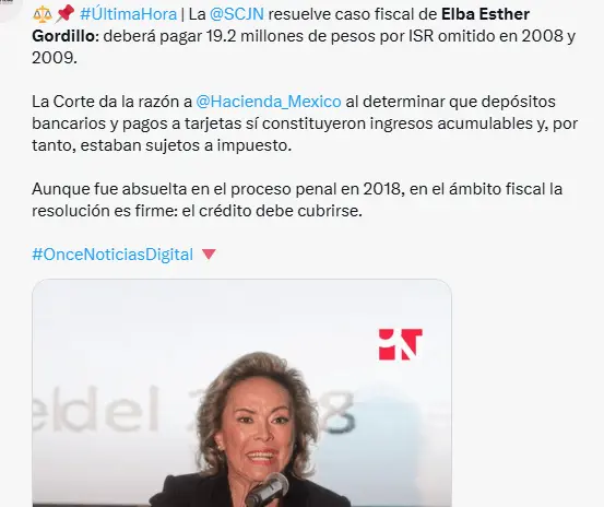 Regeneración, 20 de febrero 2026– Elba Esther Gordillo deberá entregar al Servicio de Administración Tributaria (SAT) una cantidad de 19 millones 269 mil 323 pesos como impuesto sobre la renta (ISR) debido a ingresos que no declaró durante los años 2008 y 2009.