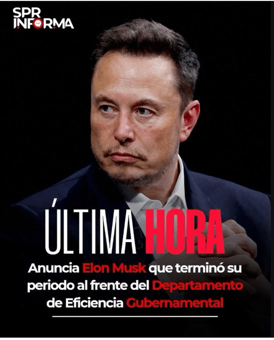 Lo anterior confirmaron agencias internacionales luego que el propio Musk anunció este miércoles que su periodo al frente del grupo de trabajo de reducción del gasto gubernamental del presidente Donald Trump llegó a su fin.